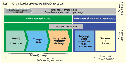 Preparations in the company to take the role of a gas distribution system operator started in early 2004, before the MGC was transformed into the MDSO, as required by the New Gas Directive. The work was based on the assumption that as the new organization is preparing for its role as an operator, it should also adjust to the new and changing conditions of the gas sector in Poland, by using specific "good practices" in both its internal and external operations, and by taking advantage of the knowledge, experience, and econometric tools provided by an outside advisor. Thus, in three years, a new organization based on identified main business processes to be performed by a distribution system operator (graph no. 1), was built nearly from scratch. As a result of these changes, on 1 April 2007, still within MGC, a new regional division of distribution services was implemented and the 3 Gas Plant Divisions and 5 Gas Distribution Districts that had existed before were replaced with the 6 Gas Facilities Divisions located in Białystok, Ciechanów, Mińsk Mazowiecki, Łódź, Radom, and Warsaw. The changes also involved replacing the five-level organizational management model with a three-level model.